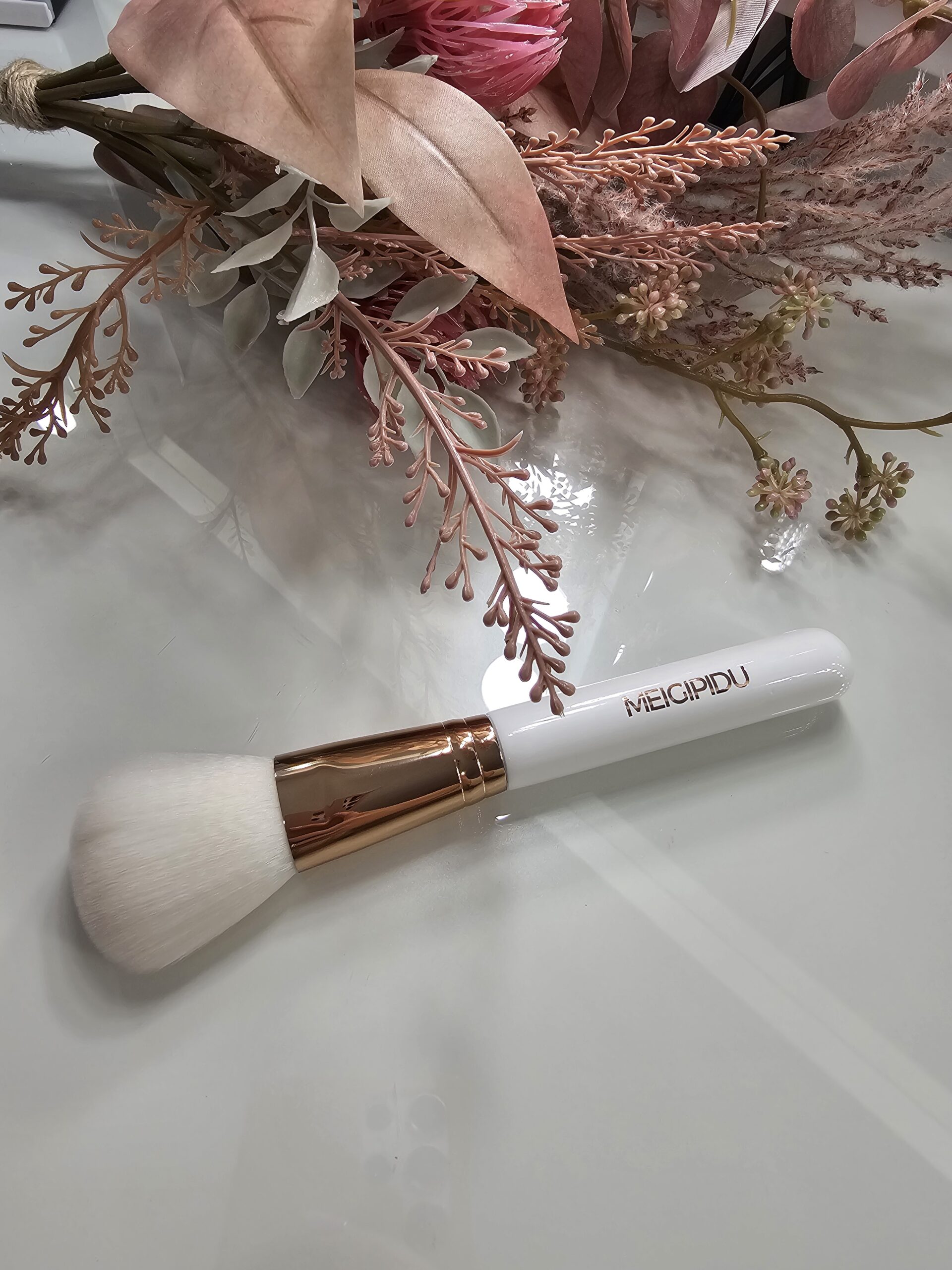 Kaunilt viimistletud puudripintsel on loodud ideaalse tulemuse saavutamiseks. Valge puidust käepide koos kuldse Meigipeo logoga ning roosakaskuldne metallkinnitus annavad pintslile luksusliku ilme. Pehmed valged sünteetilised pintslikarvad tagavad, et puuder kantakse nahale ühtlaselt ja õrnalt.
